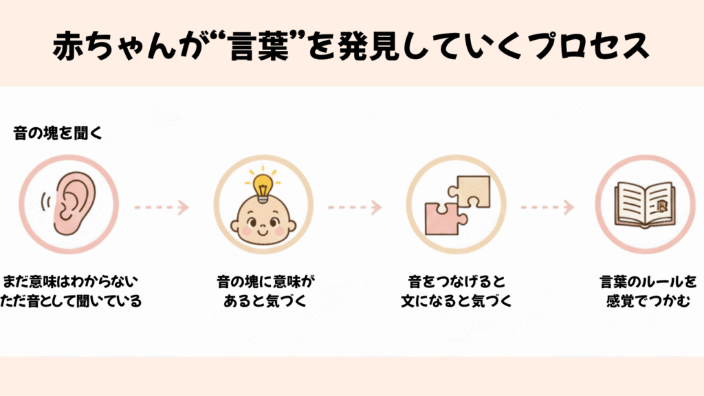 ふだん、母国語を話す時は文法のことなど意識していませんが、何も知らない乳幼児期の子どもたちは、このことに自分で発見していかなければならないのです。